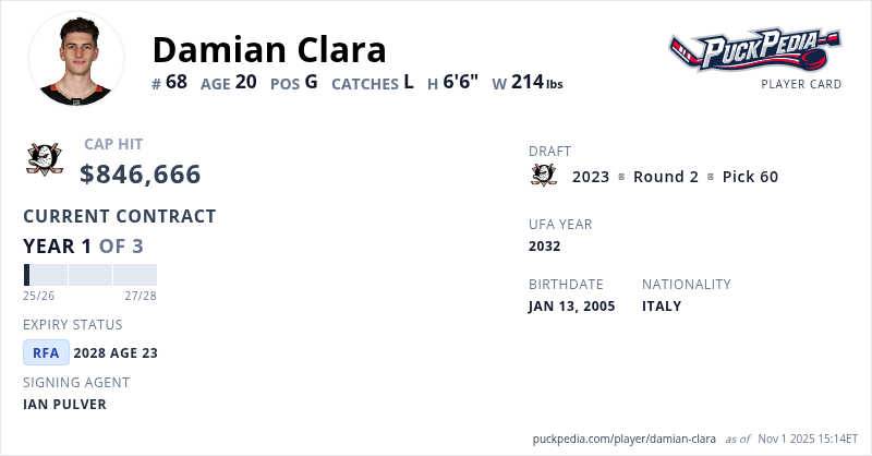 Damian Clara is signed to a 3 year, $2,539,998 contract with a cap hit of $846,666 per season, playing for the Anaheim Ducks. His contract expires at the end of the 2027-28 season, making Clara a Restricted Free Agent.