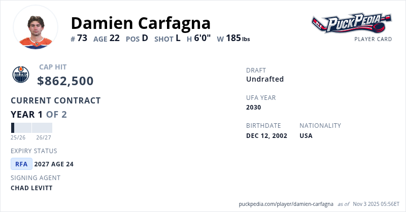 Damien Carfagna is signed to a 2 year, $1,725,000 contract with a cap hit of $862,500 per season, playing for the Edmonton Oilers. His contract expires at the end of the 2026-27 season, making Carfagna a Restricted Free Agent.