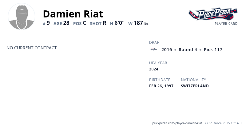 Damien Riat is a Restricted Free Agent. His last contract was 2 years, $1,635,000 with a cap hit of $817,500 per season. It expired at the end of the 2021-22 season.