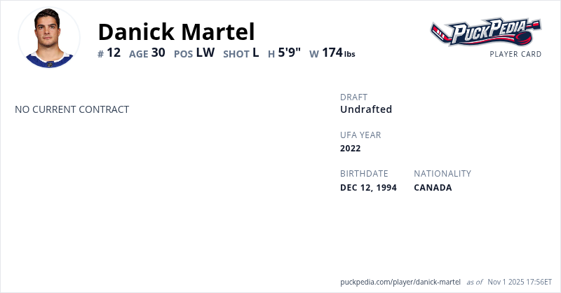 Danick Martel is an Unrestricted Free Agent. His last contract was 1 year, $700,000 with a cap hit of $700,000 per season. It expired at the end of the 2019-20 season.