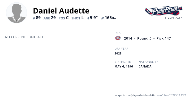 Daniel Audette is an Unrestricted Free Agent (No Qualifying Offer). His last contract was 3 years, $2,004,999 with a cap hit of $668,333 per season. It expired at the end of the 2018-19 season.