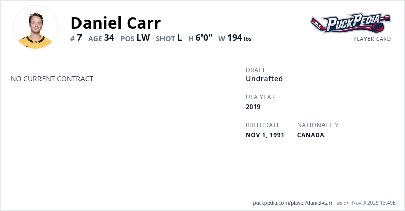 Daniel Carr is an Unrestricted Free Agent. His last contract was 1 year, $700,000 with a cap hit of $700,000 per season. It expired at the end of the 2020-21 season.