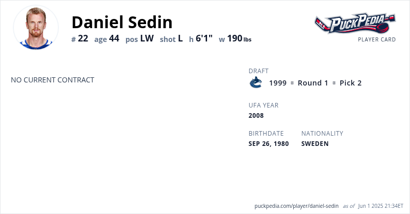 Daniel Sedin is an Unrestricted Free Agent. His last contract was 4 years, $28,000,000 with a cap hit of $7,000,000 per season. It expired at the end of the 2017-18 season.