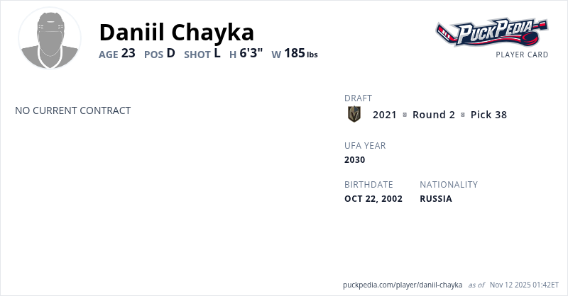 Daniil Chayka is a Restricted Free Agent. His last contract was 3 years, $2,475,000 with a cap hit of $825,000 per season.