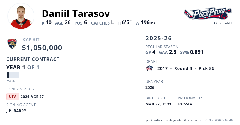 Daniil Tarasov is signed to a 1 year, $1,050,000 contract with a cap hit of $1,050,000 per season, playing for the Florida Panthers. His contract expires at the end of the 2025-26 season, making Tarasov an Unrestricted Free Agent.