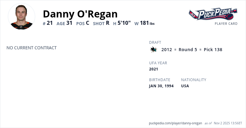 Danny O'Regan is an Unrestricted Free Agent. His last contract was 2 years, $1,500,000 with a cap hit of $750,000 per season. It expired at the end of the 2022-23 season.