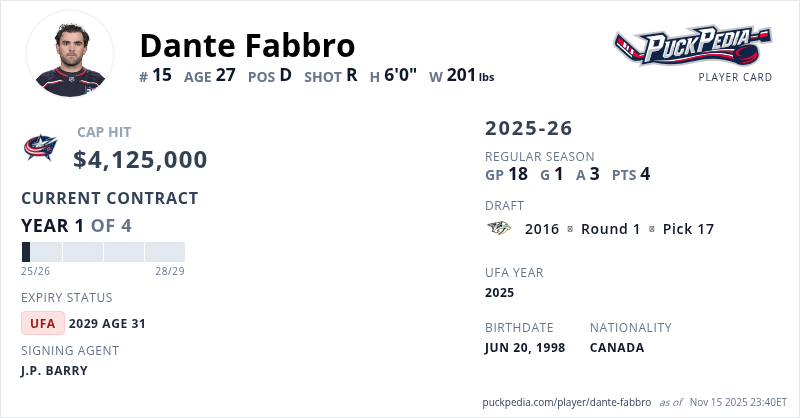 Dante Fabbro is signed to a 4 year, $16,500,000 contract with a cap hit of $4,125,000 per season, playing for the Columbus Blue Jackets. His contract expires at the end of the 2028-29 season, making Fabbro an Unrestricted Free Agent.