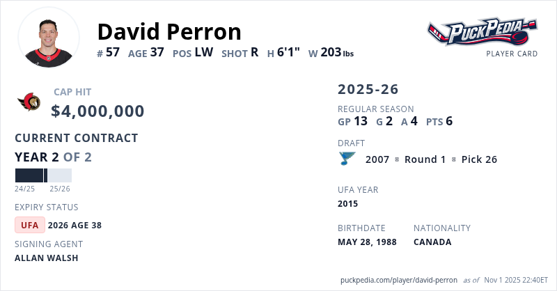 David Perron is signed to a 2 year, $8,000,000 contract with a cap hit of $4,000,000 per season, playing for the Ottawa Senators. His contract expires at the end of the 2025-26 season, making Perron an Unrestricted Free Agent.