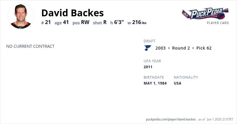 David Backes is an Unrestricted Free Agent. His last contract was 5 years, $30,000,000 with a cap hit of $6,000,000 per season. It expired at the end of the 2020-21 season.