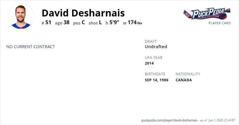 David Desharnais is an Unrestricted Free Agent. His last contract was 1 year, $1,000,000 with a cap hit of $1,000,000 per season. It expired at the end of the 2017-18 season.