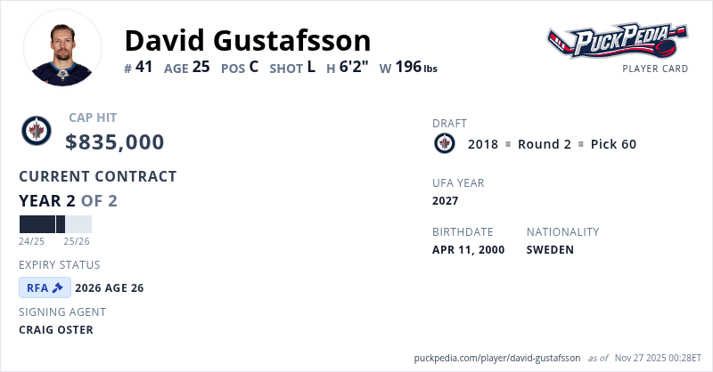 David Gustafsson is signed to a 2 year, $1,670,000 contract with a cap hit of $835,000 per season, playing for the Winnipeg Jets. His contract expires at the end of the 2025-26 season, making Gustafsson a Restricted Free Agent.