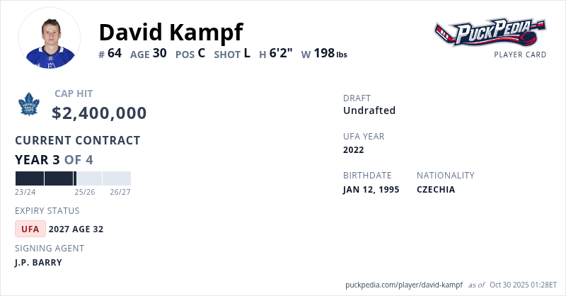 David Kampf is signed to a 4 year, $9,600,000 contract with a cap hit of $2,400,000 per season, playing for the Toronto Maple Leafs. His contract expires at the end of the 2026-27 season, making Kampf an Unrestricted Free Agent.
