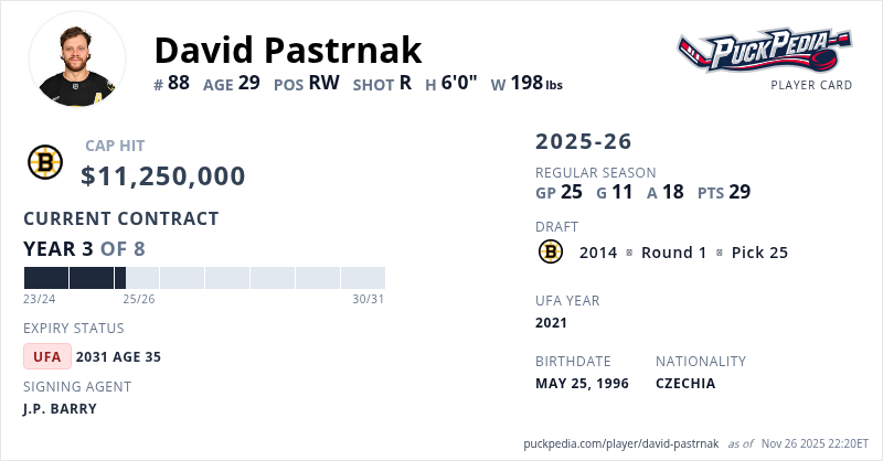 David Pastrnak is signed to a 8 year, $90,000,000 contract with a cap hit of $11,250,000 per season, playing for the Boston Bruins. His contract expires at the end of the 2030-31 season, making Pastrnak an Unrestricted Free Agent.