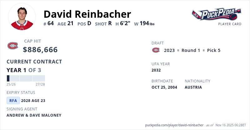 David Reinbacher is signed to a 3 year, $2,659,998 contract with a cap hit of $886,666 per season, playing for the Montreal Canadiens. His contract expires at the end of the 2027-28 season, making Reinbacher a Restricted Free Agent.