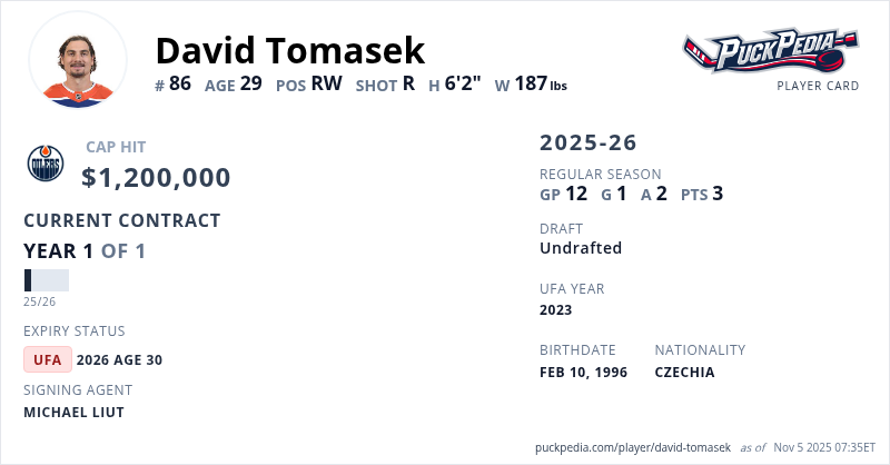 David Tomasek is signed to a 1 year, $1,200,000 contract with a cap hit of $1,200,000 per season, playing for the Edmonton Oilers. His contract expires at the end of the 2025-26 season, making Tomasek an Unrestricted Free Agent.