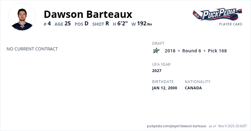 Dawson Barteaux is an Unrestricted Free Agent (No Qualifying Offer). His last contract was 3 years, $2,349,999 with a cap hit of $783,333 per season. It expired at the end of the 2022-23 season.