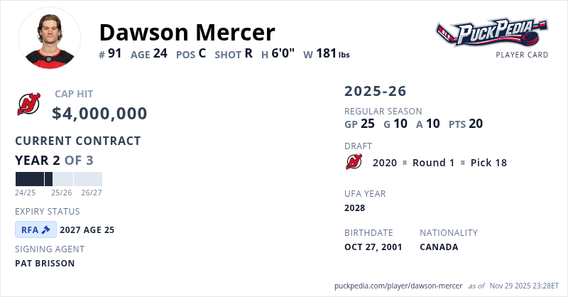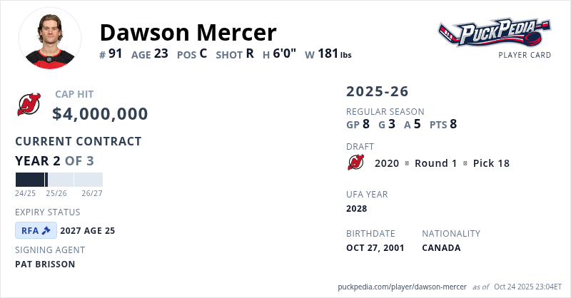 Dawson Mercer is signed to a 3 year, $12,000,000 contract with a cap hit of $4,000,000 per season, playing for the New Jersey Devils. His contract expires at the end of the 2026-27 season, making Mercer a Restricted Free Agent.