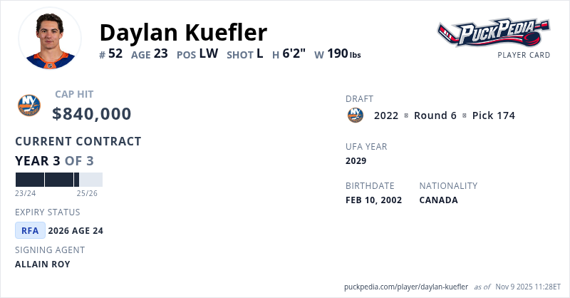 Daylan Kuefler is signed to a 3 year, $2,520,000 contract with a cap hit of $840,000 per season, playing for the New York Islanders. His contract expires at the end of the 2025-26 season, making Kuefler a Restricted Free Agent.