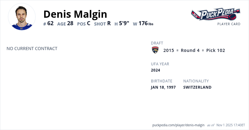 Denis Malgin is an Unrestricted Free Agent (No Qualifying Offer). His last contract was 1 year, $750,000 with a cap hit of $750,000 per season. It expired at the end of the 2022-23 season.