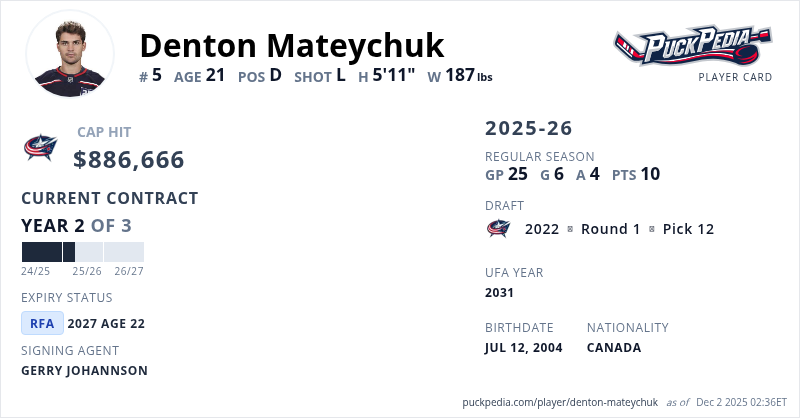 Denton Mateychuk is signed to a 3 year, $2,659,998 contract with a cap hit of $886,666 per season, playing for the Columbus Blue Jackets. His contract expires at the end of the 2026-27 season, making Mateychuk a Restricted Free Agent.
