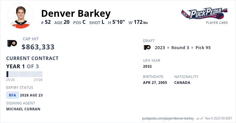 Denver Barkey is signed to a 3 year, $2,589,999 contract with a cap hit of $863,333 per season, playing for the Philadelphia Flyers. His contract expires at the end of the 2027-28 season, making Barkey a Restricted Free Agent.