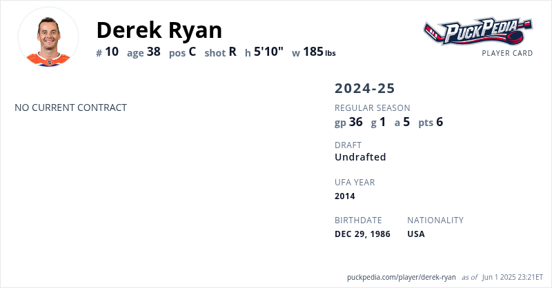 Derek Ryan is an Unrestricted Free Agent. His last contract was 2 years, $1,800,000 with a cap hit of $900,000 per season. It expired at the end of the 2024-25 season.