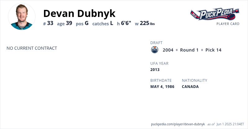 Devan Dubnyk is an Unrestricted Free Agent. His last contract was 6 years, $26,000,000 with a cap hit of $4,333,333 per season. It expired at the end of the 2020-21 season.