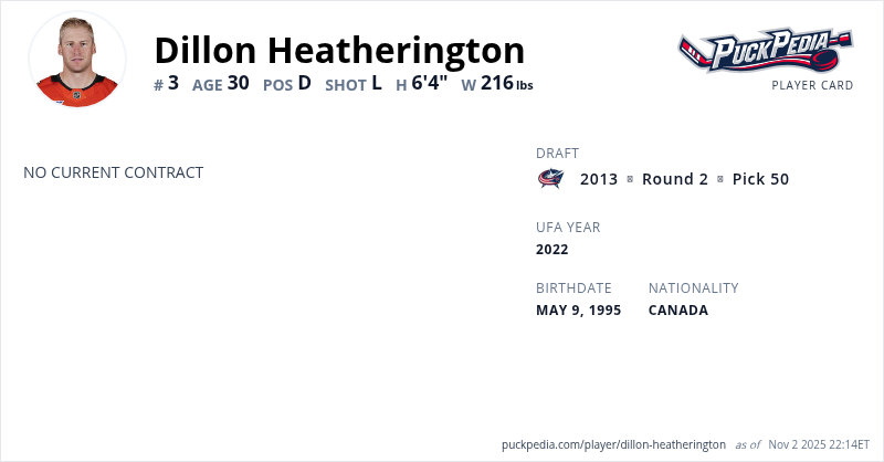 Dillon Heatherington is an Unrestricted Free Agent. His last contract was 2 years, $1,525,000 with a cap hit of $762,500 per season. It expired at the end of the 2023-24 season.