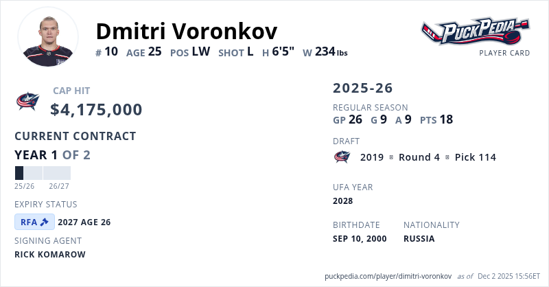Dmitri Voronkov is signed to a 2 year, $8,350,000 contract with a cap hit of $4,175,000 per season, playing for the Columbus Blue Jackets. His contract expires at the end of the 2026-27 season, making Voronkov a Restricted Free Agent.