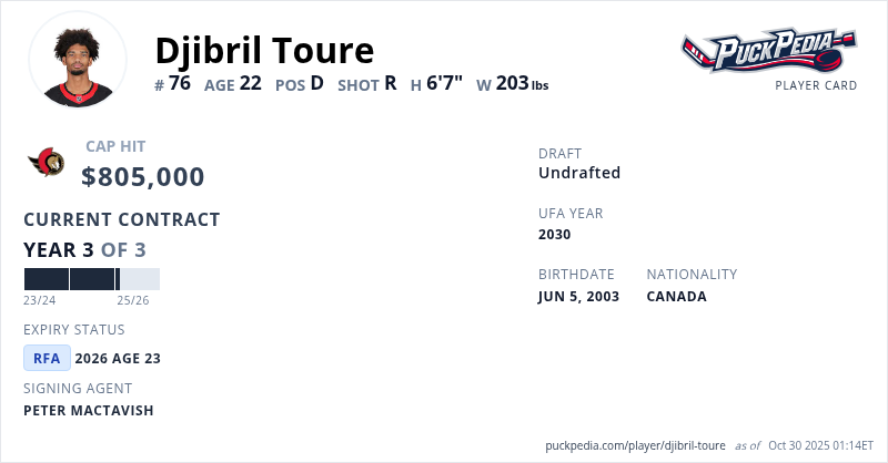 Djibril Toure is signed to a 3 year, $2,415,000 contract with a cap hit of $805,000 per season, playing for the Ottawa Senators. His contract expires at the end of the 2025-26 season, making Toure a Restricted Free Agent.