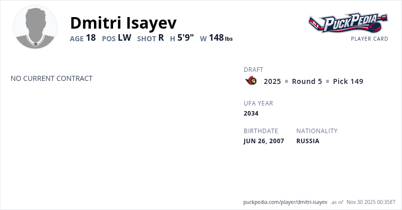 | 2024-25 | 17 | MHL | Avto Yekaterinburg | 44 | 22 | 23 | 45 | 30 | Playoffs | 5 | 2 | 2 | 4 | 0 | ||||||||||||||||