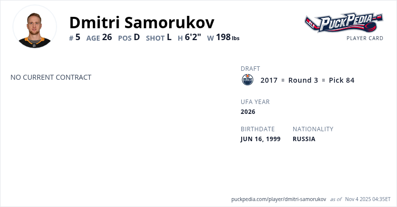 Dmitri Samorukov is an Unrestricted Free Agent (Group 6). His last contract was 1 year, $775,000 with a cap hit of $775,000 per season. It expired at the end of the 2023-24 season.