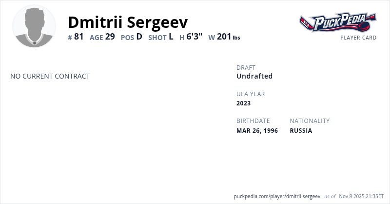 Dmitrii Sergeev is an Unrestricted Free Agent. His last contract was 3 years, $1,932,501 with a cap hit of $644,167 per season. It expired at the end of the 2018-19 season.