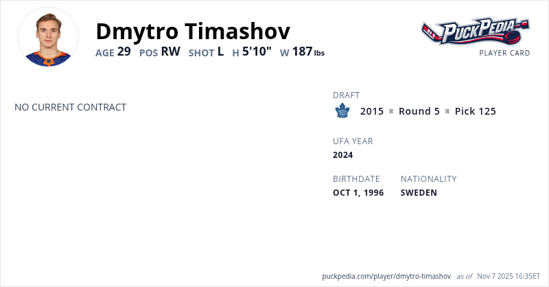 Dmytro Timashov is a Restricted Free Agent. His last contract was 1 year, $750,000 with a cap hit of $750,000 per season. It expired at the end of the 2021-22 season.