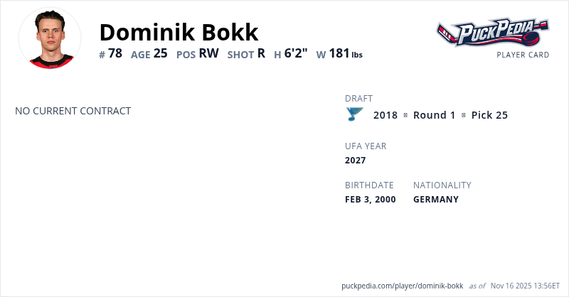 Dominik Bokk is an Unrestricted Free Agent (No Qualifying Offer). His last contract was 3 years, $2,590,002 with a cap hit of $863,334 per season. It expired at the end of the 2022-23 season.