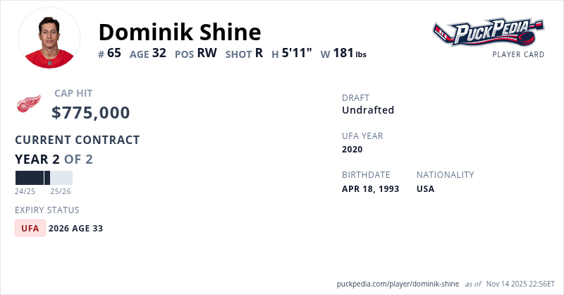 Dominik Shine is signed to a 2 year, $1,550,000 contract with a cap hit of $775,000 per season, playing for the Detroit Red Wings. His contract expires at the end of the 2025-26 season, making Shine an Unrestricted Free Agent.