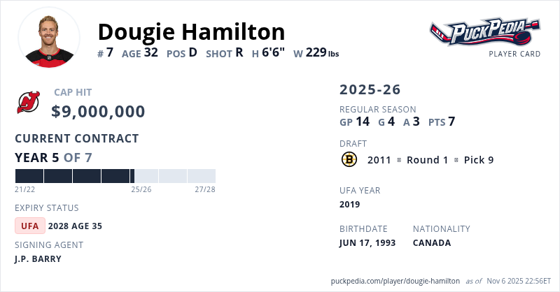 Dougie Hamilton is signed to a 7 year, $63,000,000 contract with a cap hit of $9,000,000 per season, playing for the New Jersey Devils. His contract expires at the end of the 2027-28 season, making Hamilton an Unrestricted Free Agent.