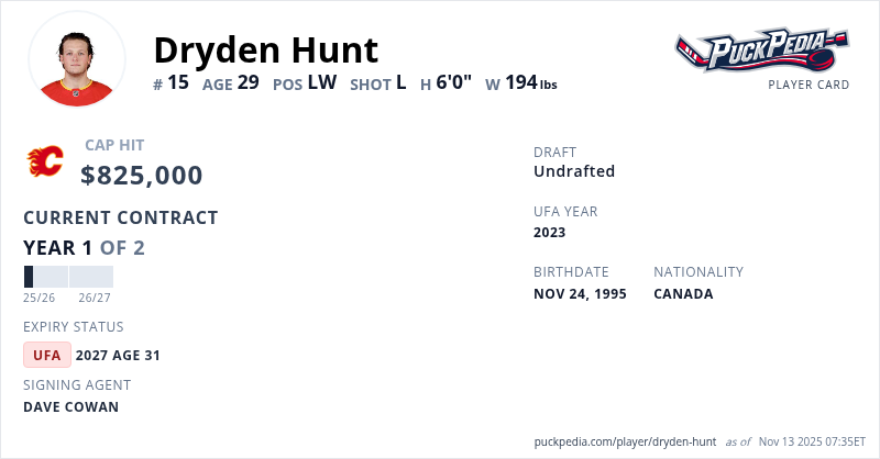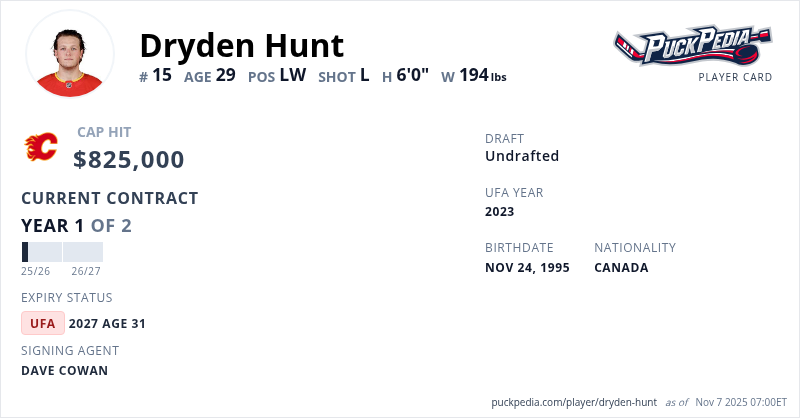 Dryden Hunt is signed to a 2 year, $1,650,000 contract with a cap hit of $825,000 per season, playing for the Calgary Flames. His contract expires at the end of the 2026-27 season, making Hunt an Unrestricted Free Agent.