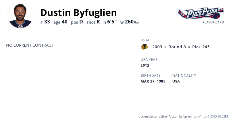 Dustin Byfuglien is an Unrestricted Free Agent. His last contract was 5 years, $38,000,000 with a cap hit of $7,600,000 per season. It expired at the end of the 2020-21 season.