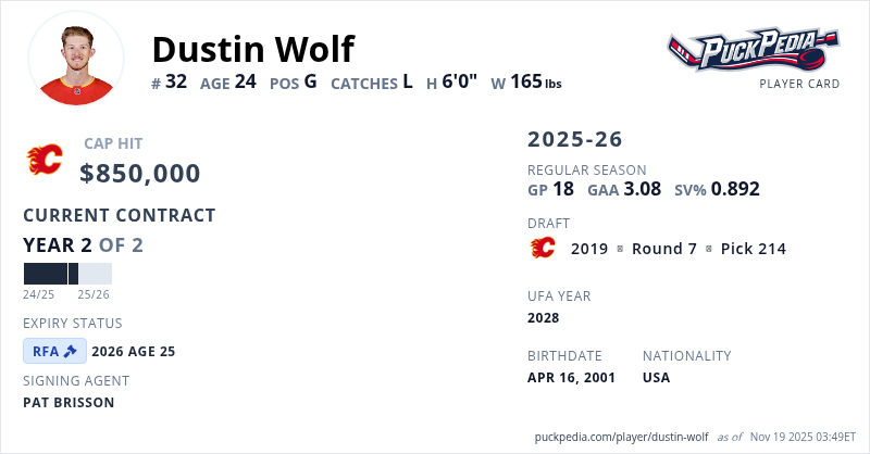 Dustin Wolf is signed to a 7 year, $52,500,000 contract extension with a cap hit of $7,500,000 per season. He plays for the Calgary Flames. His next contract begins for the 2026-27 season and expires at the end of the 2032-33 season, making him an Unrestricted Free Agent.