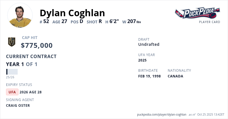 Dylan Coghlan is signed to a 1 year, $775,000 contract with a cap hit of $775,000 per season, playing for the Vegas Golden Knights. His contract expires at the end of the 2025-26 season, making Coghlan an Unrestricted Free Agent.