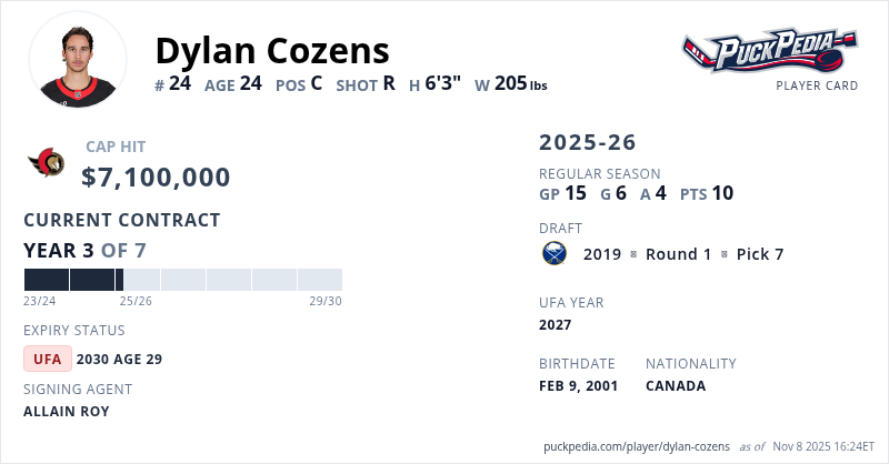 Dylan Cozens is signed to a 7 year, $49,700,000 contract with a cap hit of $7,100,000 per season, playing for the Ottawa Senators. His contract expires at the end of the 2029-30 season, making Cozens an Unrestricted Free Agent.