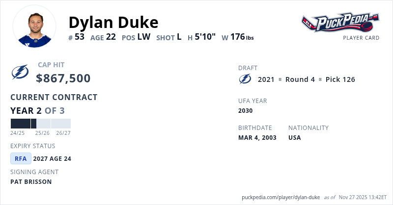 Dylan Duke is signed to a 3 year, $2,602,500 contract with a cap hit of $867,500 per season, playing for the Tampa Bay Lightning. His contract expires at the end of the 2026-27 season, making Duke a Restricted Free Agent.