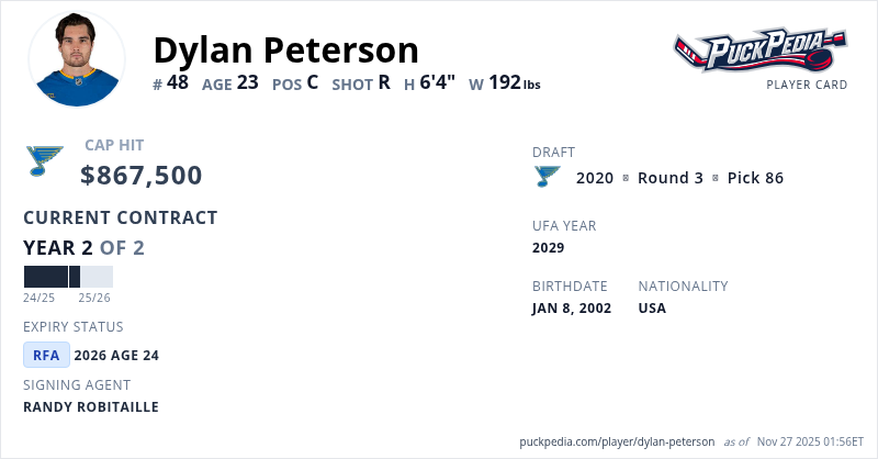 Dylan Peterson is signed to a 2 year, $1,735,000 contract with a cap hit of $867,500 per season, playing for the St. Louis Blues. His contract expires at the end of the 2025-26 season, making Peterson a Restricted Free Agent.