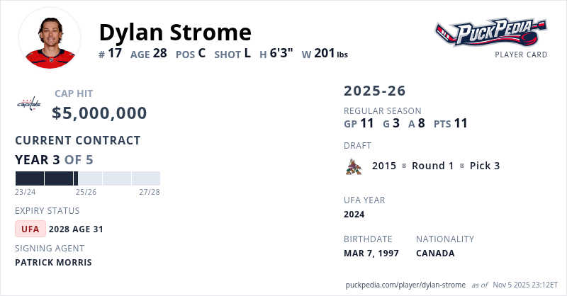 Dylan Strome is signed to a 5 year, $25,000,000 contract with a cap hit of $5,000,000 per season, playing for the Washington Capitals. His contract expires at the end of the 2027-28 season, making Strome an Unrestricted Free Agent.