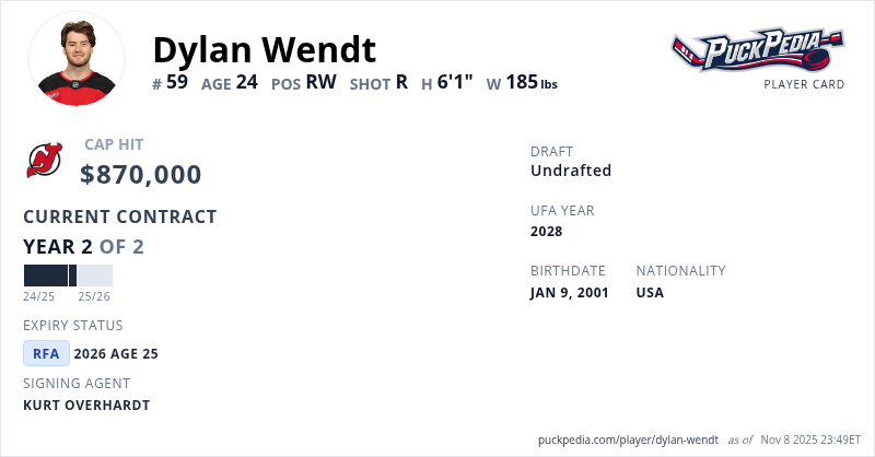 Dylan Wendt is signed to a 2 year, $1,740,000 contract with a cap hit of $870,000 per season, playing for the New Jersey Devils. His contract expires at the end of the 2025-26 season, making Wendt a Restricted Free Agent.