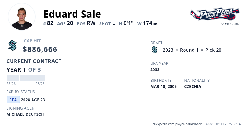 Eduard Sale is signed to a 3 year, $2,659,998 contract with a cap hit of $886,666 per season, playing for the Seattle Kraken. His contract expires at the end of the 2027-28 season, making Sale a Restricted Free Agent.