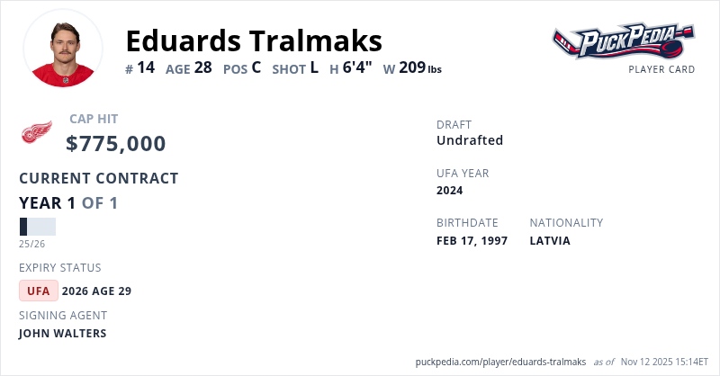 Eduards Tralmaks is signed to a 1 year, $775,000 contract with a cap hit of $775,000 per season, playing for the Detroit Red Wings. His contract expires at the end of the 2025-26 season, making Tralmaks an Unrestricted Free Agent.