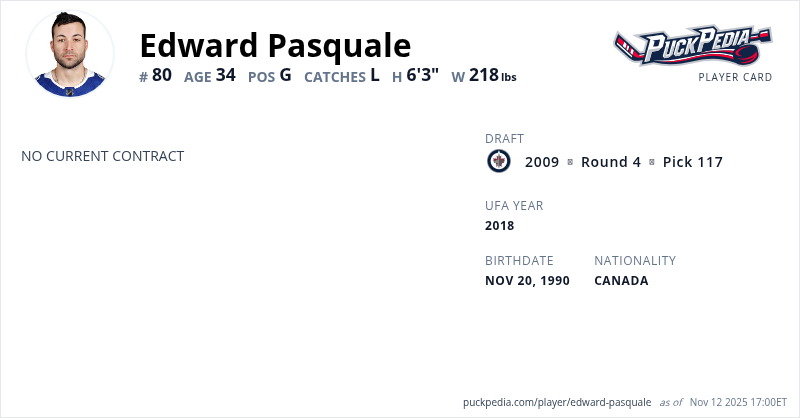 Edward Pasquale is an Unrestricted Free Agent. His last contract was 1 year, $650,000 with a cap hit of $650,000 per season. It expired at the end of the 2018-19 season.