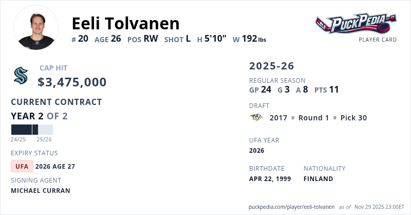 Eeli Tolvanen is signed to a 2 year, $6,950,000 contract with a cap hit of $3,475,000 per season, playing for the Seattle Kraken. His contract expires at the end of the 2025-26 season, making Tolvanen an Unrestricted Free Agent.